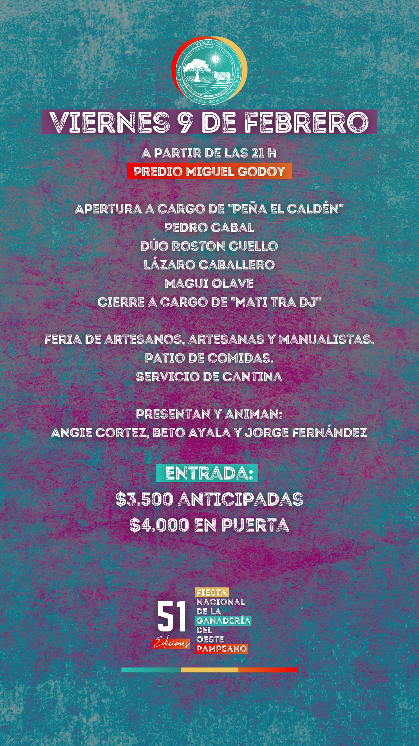 En tanto, el viernes la Peña El Caldén iniciará la velada. Luego subirán Pedro Cabal, el Dúo Roston Cuello, Lázaro Caballero, y Magui Olave. Mientras que el cierre a puro baile estará a cargo de Mati Tra DJ.