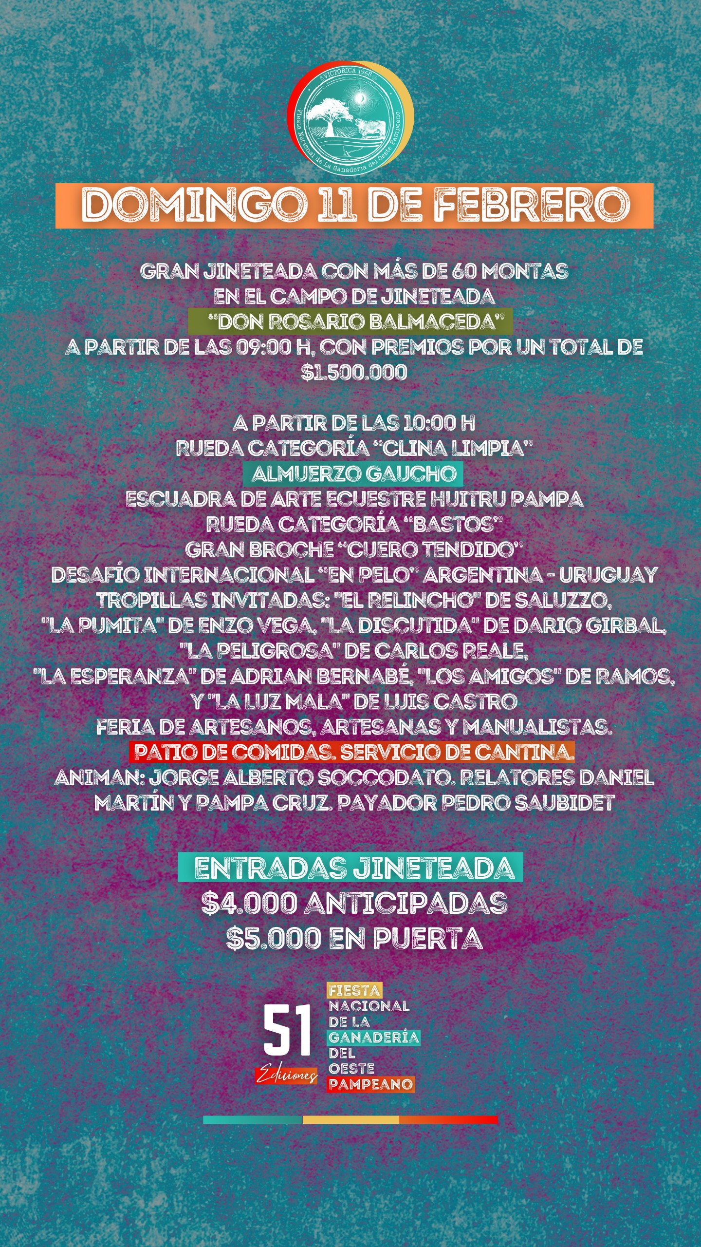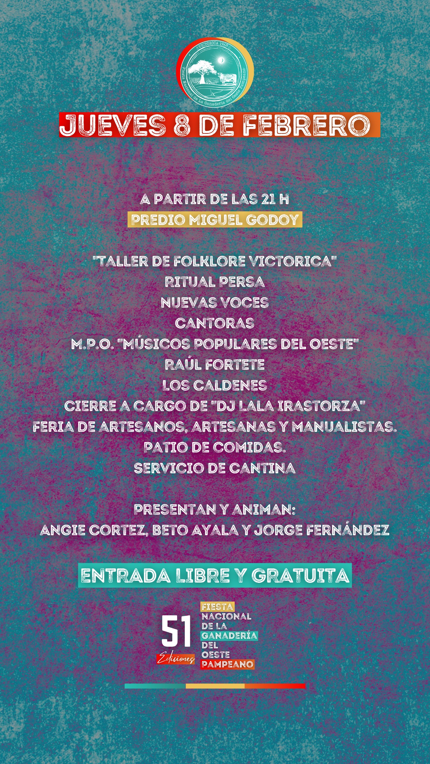 La municipalidad de Victorica confirmó la realización de la 51 edición de la Fiesta Nacional de la Ganadería del Oeste Pampeano. Además publicó una nutrida grilla de actividades y espectáculos. La festividad abrirá el jueves 8 de febrero y cerrará el domingo 11 con una jineteada.