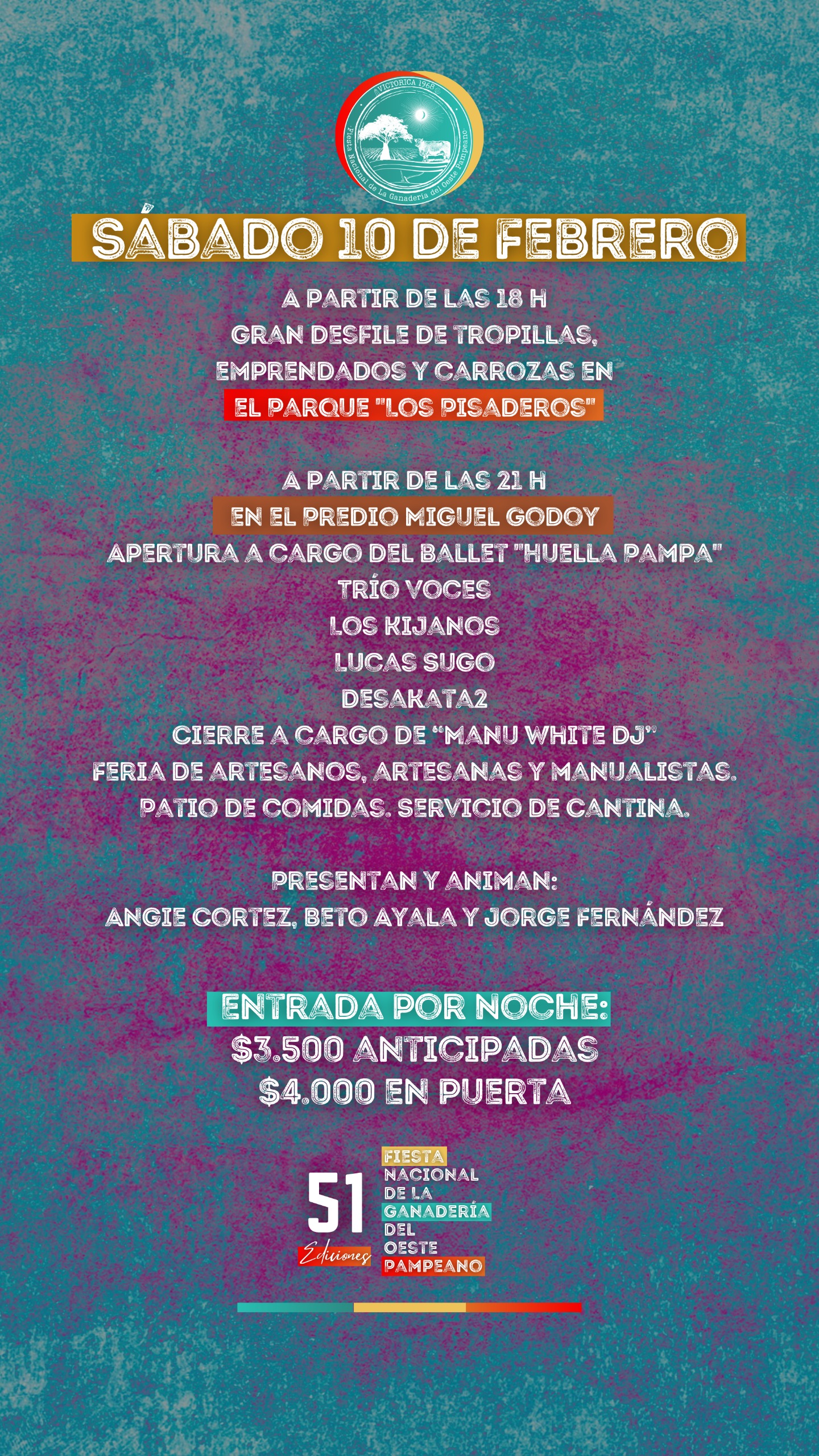 El sábado, comenzará a las 18 en el parque “Los Pisaderos”, donde se realizará un gran desfile de tropillas, emprendados y carrozas. Luego la fiesta seguirá a las 21 en el predio ferial donde actuarán el ballet Huella Pampa, y se presentarán el Trío Voces, Los Kijanos, Lucas Sugo y Desakata2. Y el cierre será con baile animado por Manu White DJ.