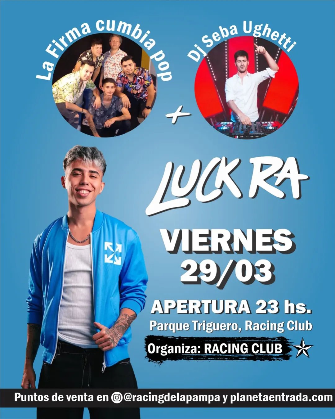 El cantante cordobés Luck Ra llegará este mes a La Pampa contratado por Racing Club de Eduardo Castex. El artista fenómeno musical del momento con su tema «La Morocha» y otros hits actuará en el parque triguero de la ciudad castense el 29 de marzo.