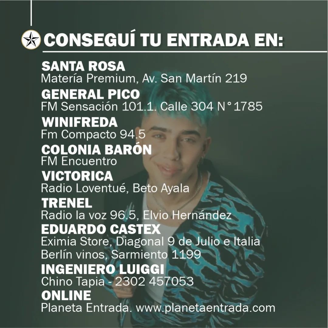 Las entradas anticipadas tienen un valor de 10.000 pesos. Pueden adquirirse de manera online por www.planetaentrada.com. También se venden físicamente en ocho localidades pampeanas más en Castex. Menores de 12 años no pagan pero deberán estar acompañados por un mayor y ambos presentar el DNI. En puerta tendrán otro valor que «se está evaluando».