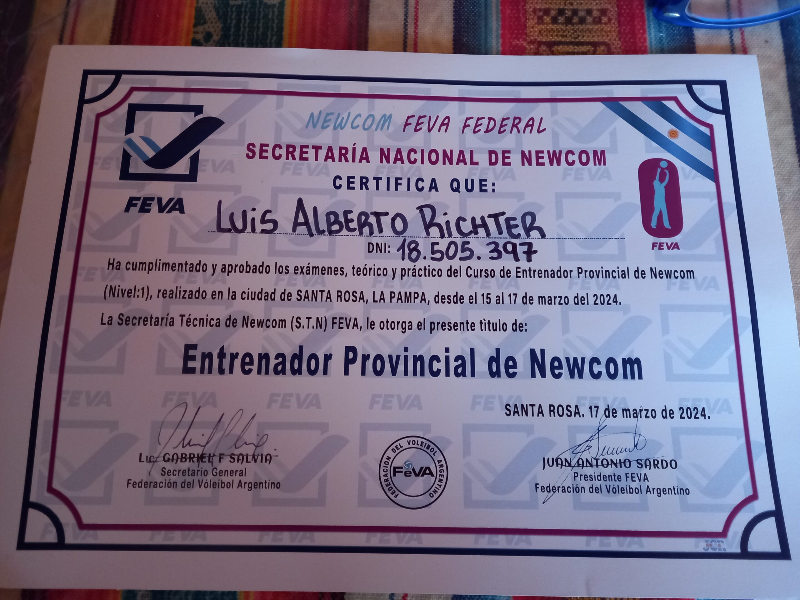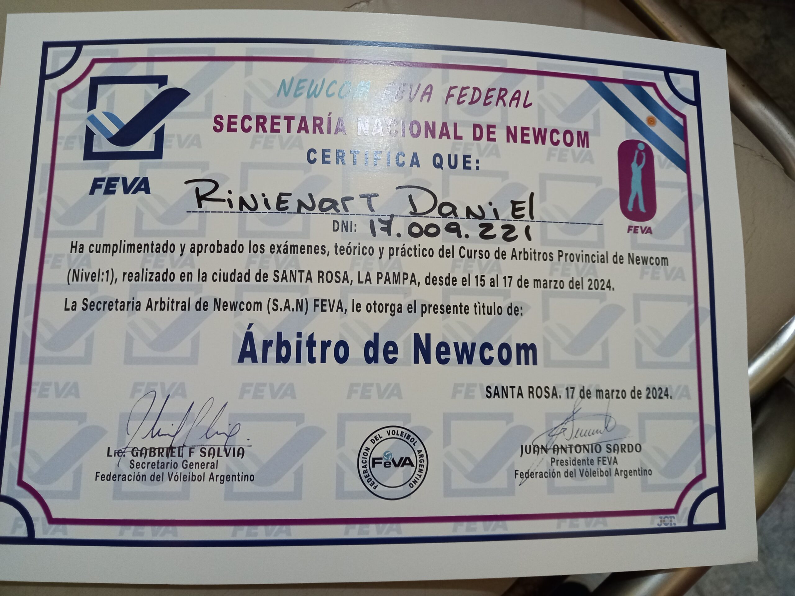 Sus diplomas están firmados por el presidente y secretario de la Federación del Voleibol Argentino (FEVA) Juan Antonio Sardo y Gabriel Salvia respectivamente.