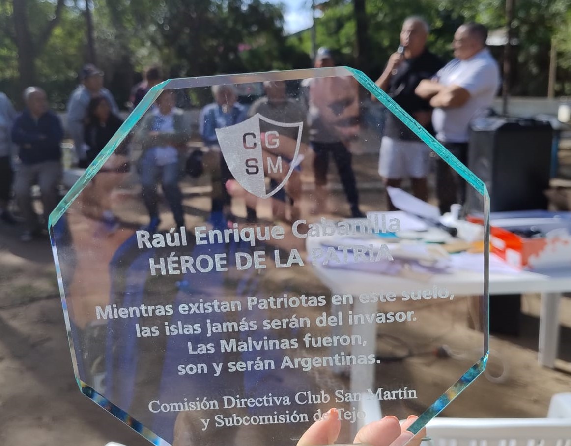 Cabanilla recibió una plaqueta de vidrio. «Raúl Enrique Cabanilla. Héroe de la Patria. Mientras existan patriotas en este suelo, las islas jamás serán del invasor. Las Malvinas fueron, son y serán argentinas», dice el texto.