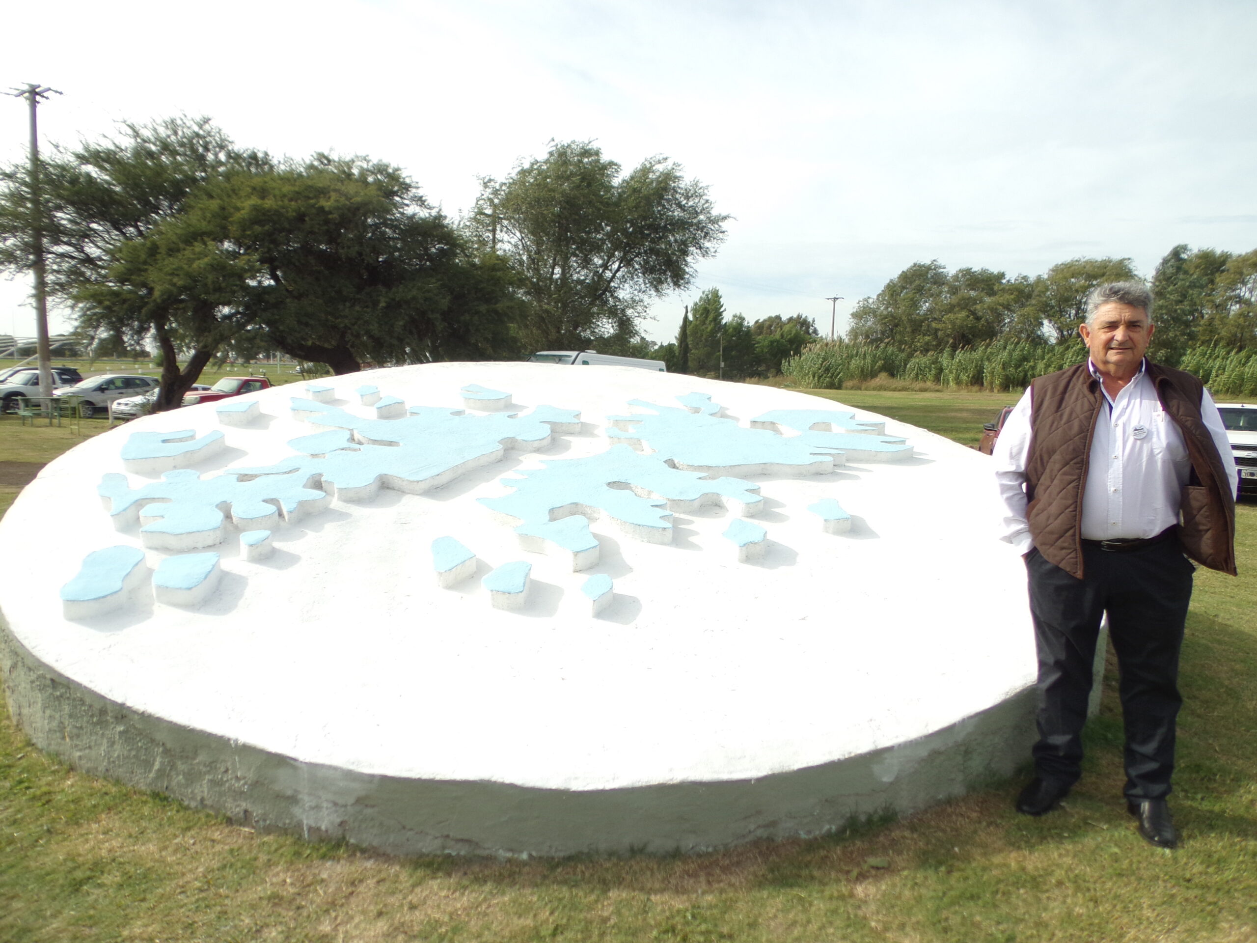 Foto: Juan Carlos Miranda al lado de una réplica de las Islas Malvinas.