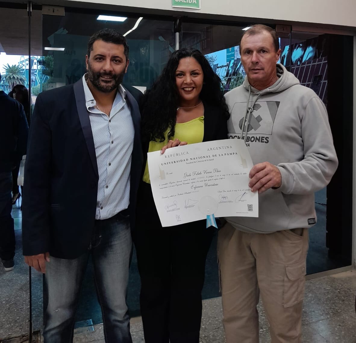 Gisela recibió el diploma que acredita los años de estudio acompañada por sus hijas Tiana y Mía que son sus grandes amores; su madre; su hermano Franco que es enfermero, médico generalista y director del Hospital de la localidad pampeana de Doblas; su mejor amigo, Cesar Santos de Winifreda, y demás amistades.
