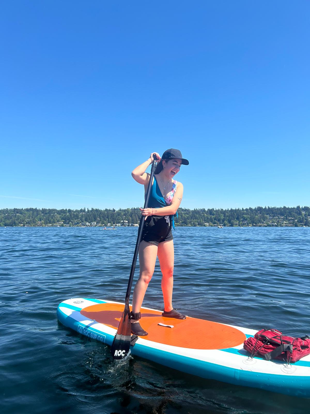 En el lago haciendo paddle boarding.