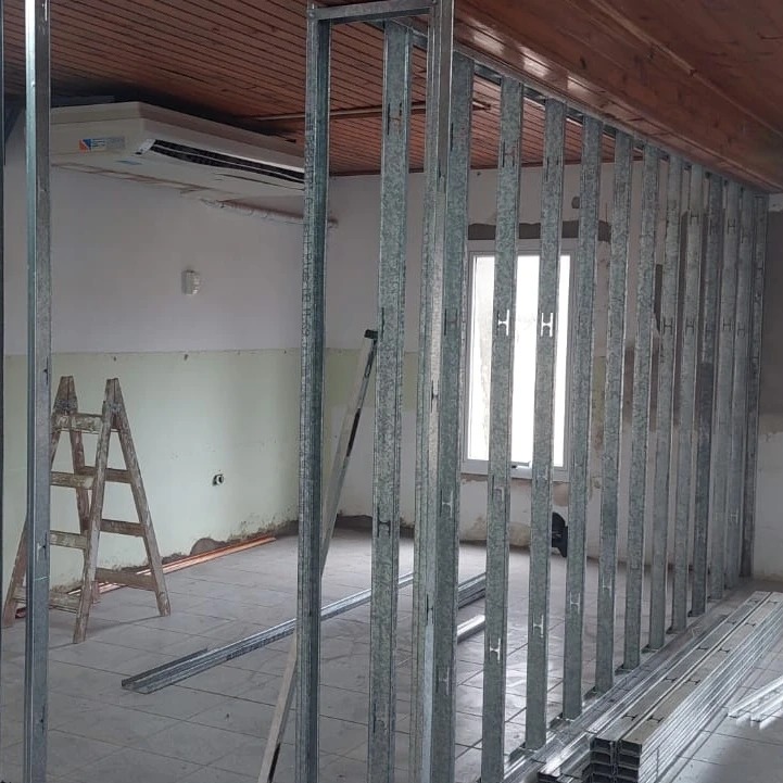 Foto: Albañiles arman futuras habitaciones con perfiles galvanizados.