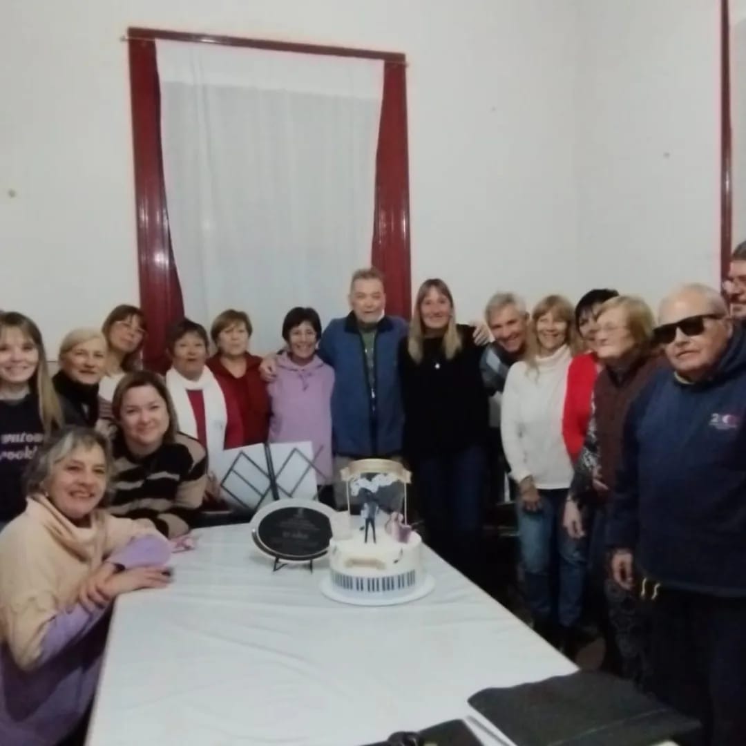 Stadler asistió el viernes a la clase semanal del coro para homenajear a este taller, su profesor y coreutas. Al grupo presente le hizo entrega de una plaqueta que dice «Reconocimiento Coro Municipal de Colonia Barón y a su director Alejandro Yicarean por sus 25 años de trayectoria coral y su significativo aporte a la actividad musical y cultural de nuestro pueblo. 1999-21 de junio-2024».