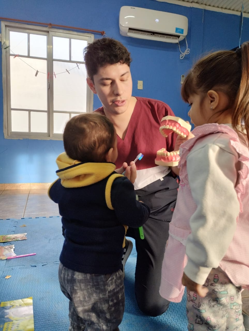 Las seños del espacio «ya habían trabajado previamente el tema con ayuda de videos y demás. Yo llevé una dentadura para enseñarles la manera correcta de cepillarse los dientes todos los días, ellos también practicaron sobre la dentadura, les mencioné la importancia de consumir alimentos sanos y en lo posible dejar de lado los dulces. Todo lo hicimos a modo de juegos para que asimilen los conocimientos y de chiquitos se vayan independizando», comentó Gatica a Infowini. «Me llevé una buena impresión, jugamos, comprendieron, les regalamos cepillos, todo fue más que positivo», señaló.