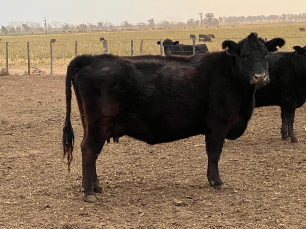 «Es una vaca Aberdeen Angus negra de 4 años de vida. En marzo de 2023 fue madre primeriza de mellizos, alumbró una hembra negra y un macho colorado. La verdad unos terneritos muy lindos. Había sido preñada por un toro Aberdeen Angus Puro Controlado (PC) nacido por inseminación artificial en nuestro campo», contó Alexis Gette en diálogo con Infowini.