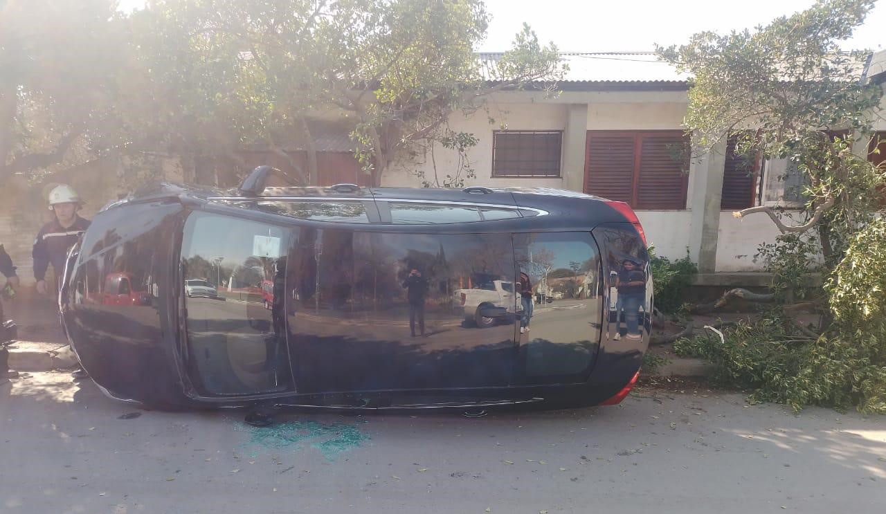 Dos personas de esta localidad resultaron ilesas luego de que protagonizaran un vuelco con un auto de alta gama. El incidente vial ocurrió ayer martes, en horas de la siesta, a media cuadra del edificio policial y frente a la plaza San Martín.