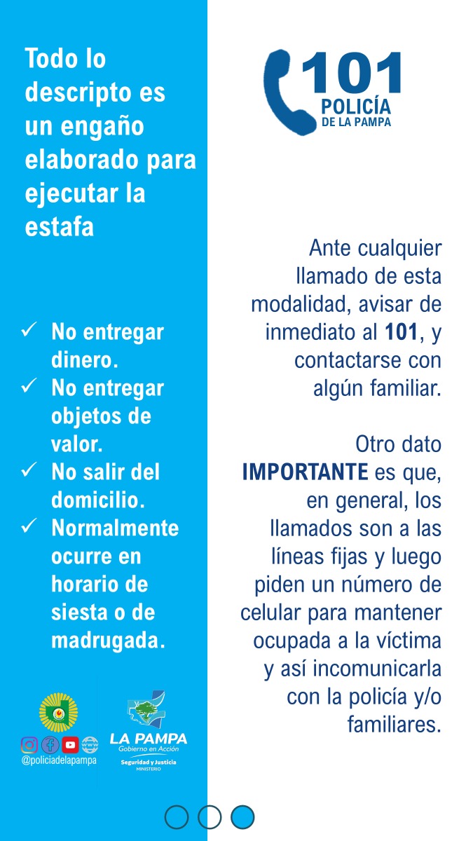 Recomendaciones: Contactar inmediatamente al 101 y a un familiar cercano. No entregar dinero ni objetos de valor. No salir del domicilio. Prestar atención a las llamadas en líneas fijas.