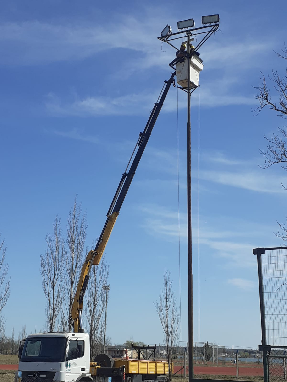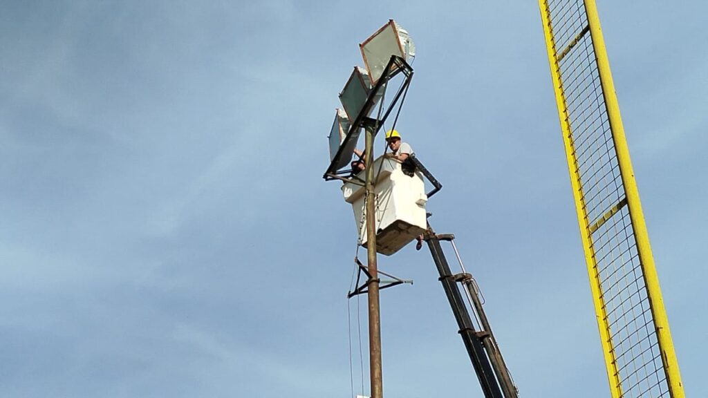 Los trabajos comenzaron el lunes de la semana pasada cuando el operario de la cooperativa «Hugo Bellendir con sus muchachos hicieron un relevamiento y desde el martes hasta el jueves colocaron las 29 luminarias de 500 watts cada una en las ocho torres metálicas de 18 metros de altura, en cinco de ellas hay cuatro artefactos y en el resto tres. Las luces son concentradas y difusas, debidamente combinadas generan una luminosidad realmente increíble».