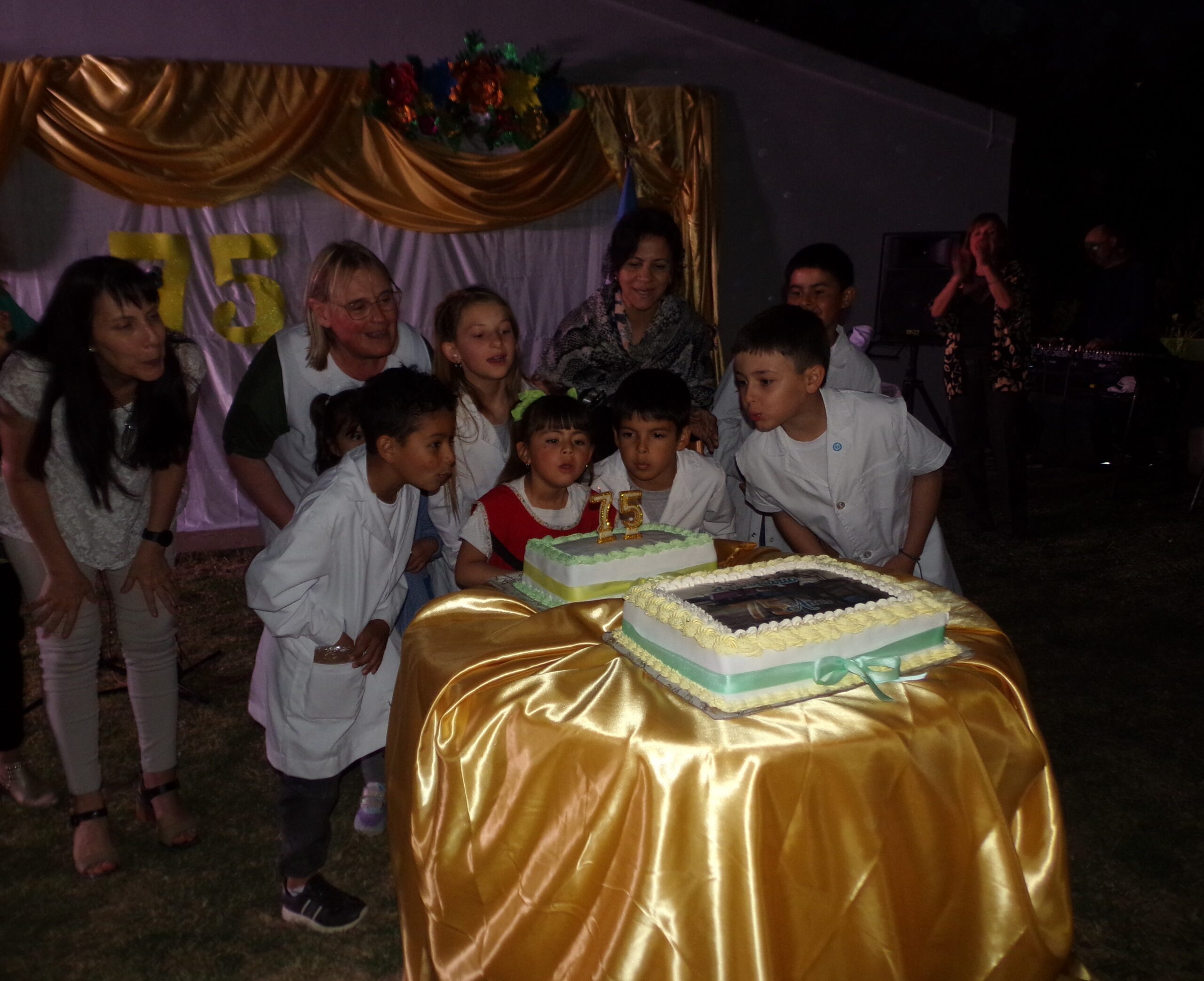 El acto continuó con el descubrimiento de una placa recordatoria de los 75 años, un minuto de silencio en memoria de todos aquellos que transitaron por la escuela y ya no están físicamente en este mundo, palabras y bendición del sacerdote Mariano Cestac. Se entregaron reconocimientos a ex docentes, ex alumnos, ex porteros y personal de servicio en actividad. Después apareció la torta aniversario y todos le cantaron el feliz cumpleaños a la escuela. Seguidamente los alumnos con su docente interpretaron un fragmento del poema “Escuela campesina” escrito por Darío Lobos y musicalizado por Gabriel Raíz quien también puso su voz. Finalmente actuó el folclorista Hilario Torres. Las horas pasaron, ya había transcurrido el ocaso y era de noche. Los momentos de camaradería continuaron.
