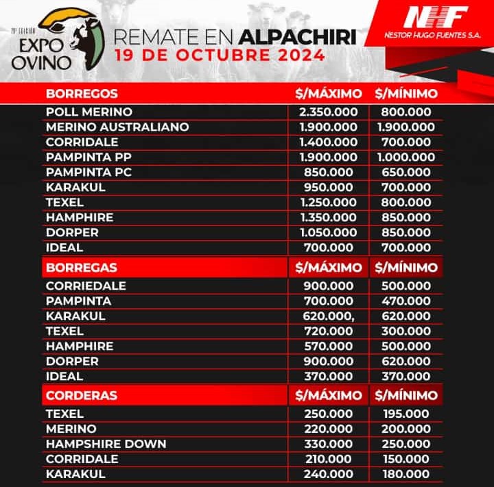 A continuación, un banner con el detalle completo de los precios conseguidos en el remate de la edición número 20 de la Expo Ovino Alpachiri 2024.