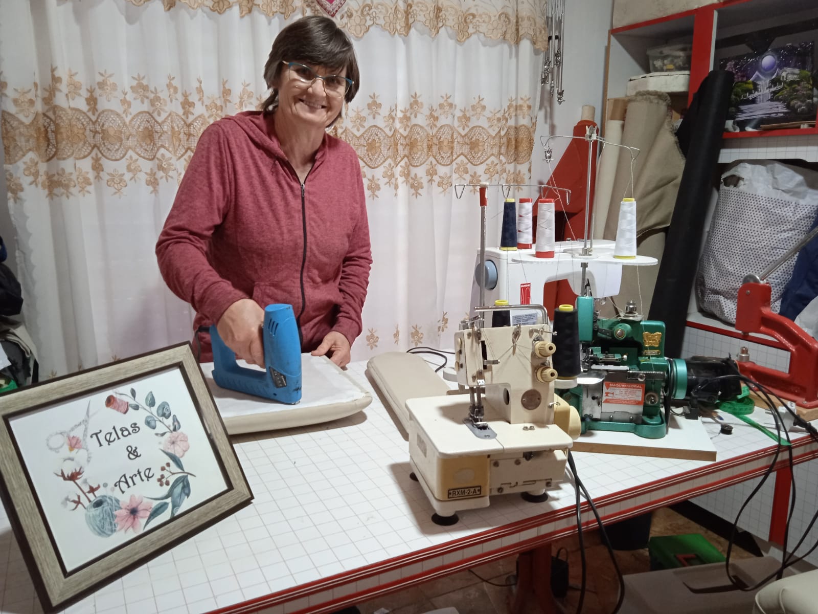 En ese espacio instaló una máquina de costura recta, una collareta que utiliza para las telas con espandex, una overlok, diseñada específicamente para evitar el deshilachado y proporcionar acabados profesionales en los bordes de las telas, y una ojaleadora para colocar ojalillos. La herramienta manual que usa es la engrapadora eléctrica. Pasa horas y horas en su taller.