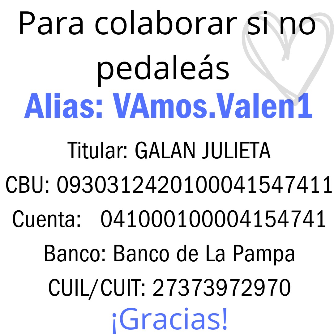 El biciperegrino invitó a los pampeanos a sumarse a la causa con un aporte económico voluntario para ayudar al niño. «Todos aquellos que tengan la posibilidad de colaborar les pedio que lo hagan. Sabemos lo costoso que es un tratamiento prolongado, y todo lo que se pueda juntar será muy bien recibido para la familia, le daremos un respiro», finalizó Escudero.