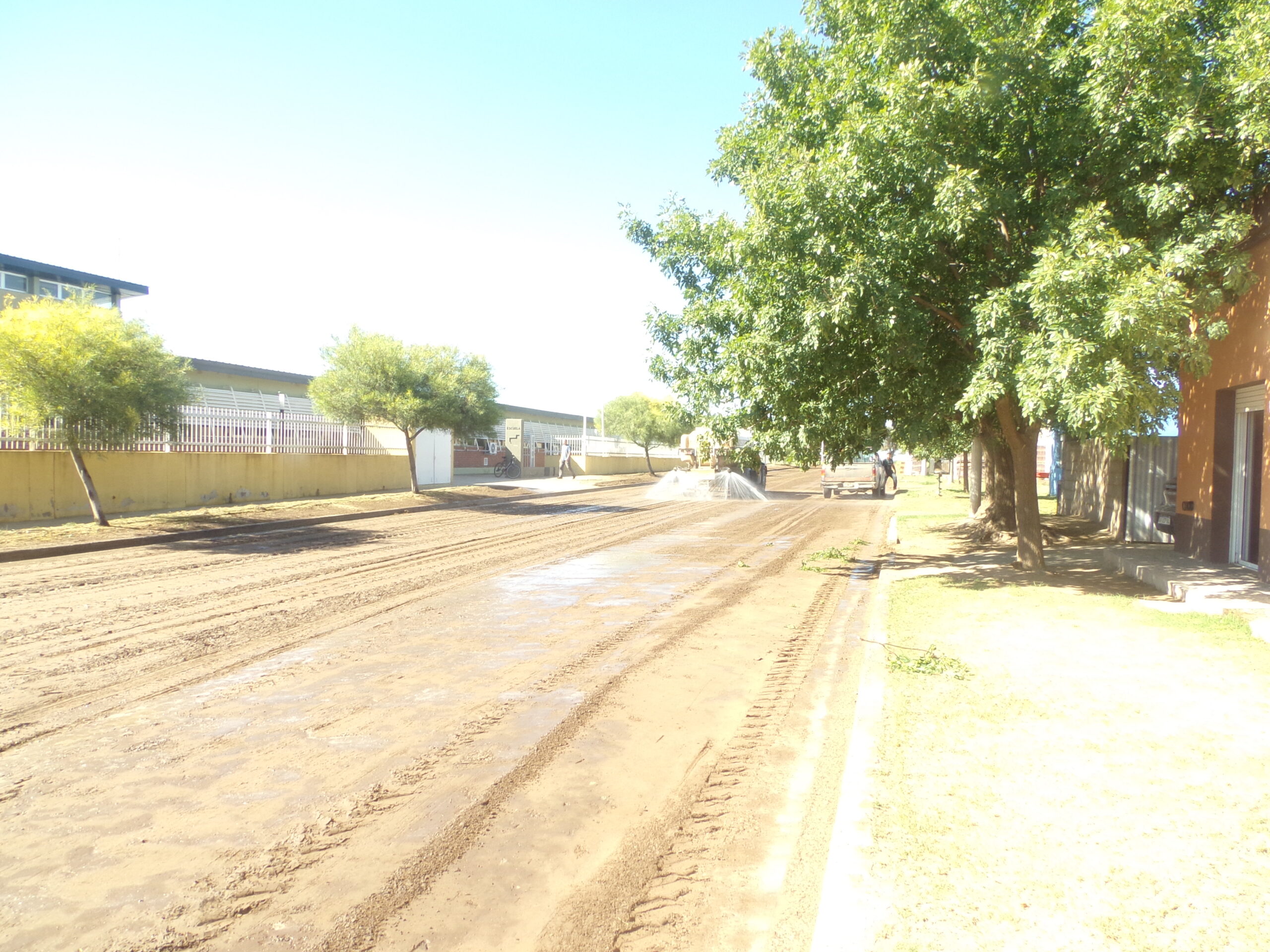 También, la cuchilla de la máquina vial desparramó la tierra que desde el año pasado cubría el cordón cuneta que linda con el edificio escolar. La arteria fue regada varias veces por un camión regador y quedó hecha un billar.