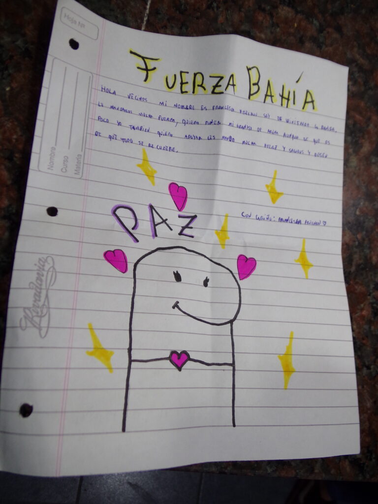 Foto: «Fuerza Bahía», reza la carta de una niña de Winifreda.