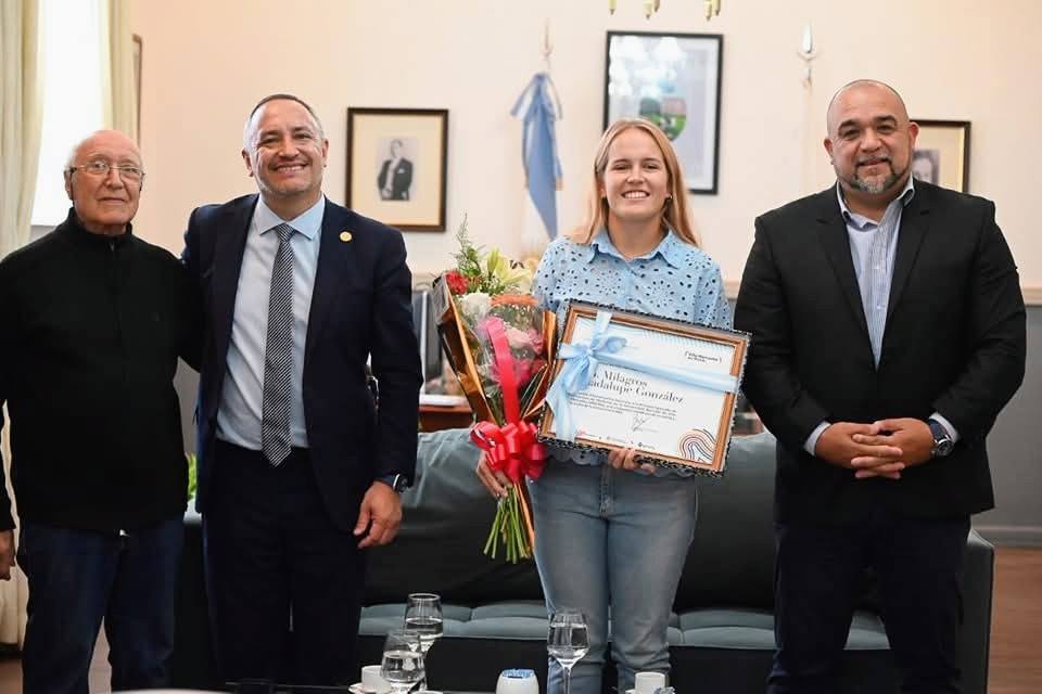 El intendente de Villa Mercedes, Maximiliano Frontera, entregó un reconocimiento a la primera egresada de la carrera de Medicina de la Universidad Nacional de Villa Mercedes (UNViMe). La distinguida es la joven pampeana Milagros “Pipi” González, oriunda de Winifreda.