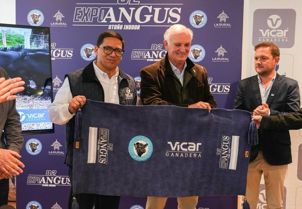 Luego del remate, compartió una foto con Alfonso Bustillo, presidente de la Asociación Argentina de Angus, y el victoriquense Ezequiel Gesualdi, titular de Vicar Ganadera, recibiendo el aplauso del público.