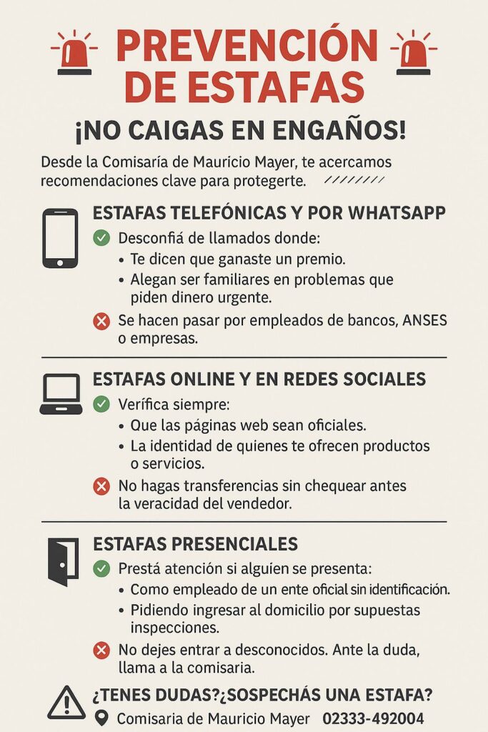 Personal de la subcomisaría de Mauricio Mayer realizó esta semana una campaña de prevención de estafas en instituciones y viviendas. El encargado de la dependencia, el oficial ayudante Ezequiel Carranza, y efectivos a su cargo, entregaron folletos en la municipalidad, el Juzgado de Paz, la biblioteca, el centro de salud, el cajero automático y en […]