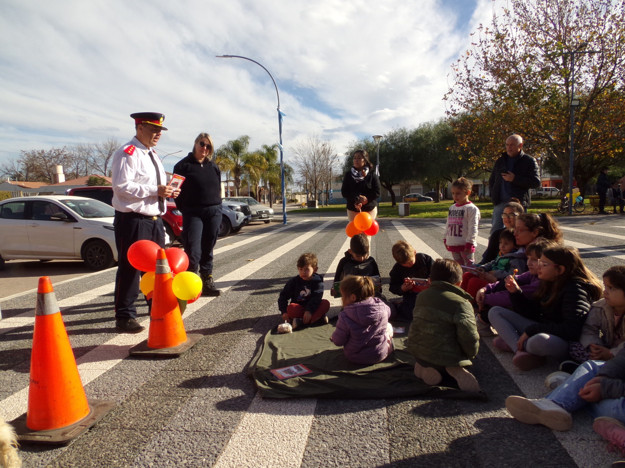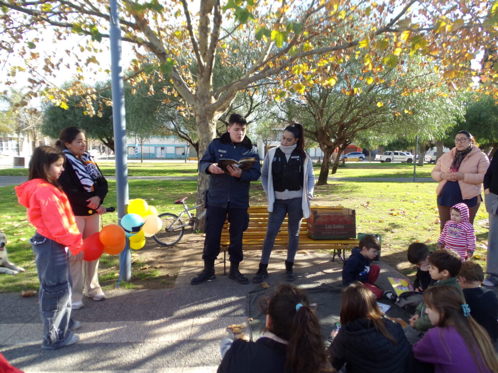 En la estación de la Comisaría se encontraba un grupo de policías, tanto hombres como mujeres, con sus distintos uniformes. «Nos ven a la salida de la escuela y patrullando las calles, estamos allí para protegerlos», manifestaron. «De los ladrones», respondió un niño ante una pregunta. Uno de los agentes captó la atención de los menores con el relató «El misterio del huevo robado».