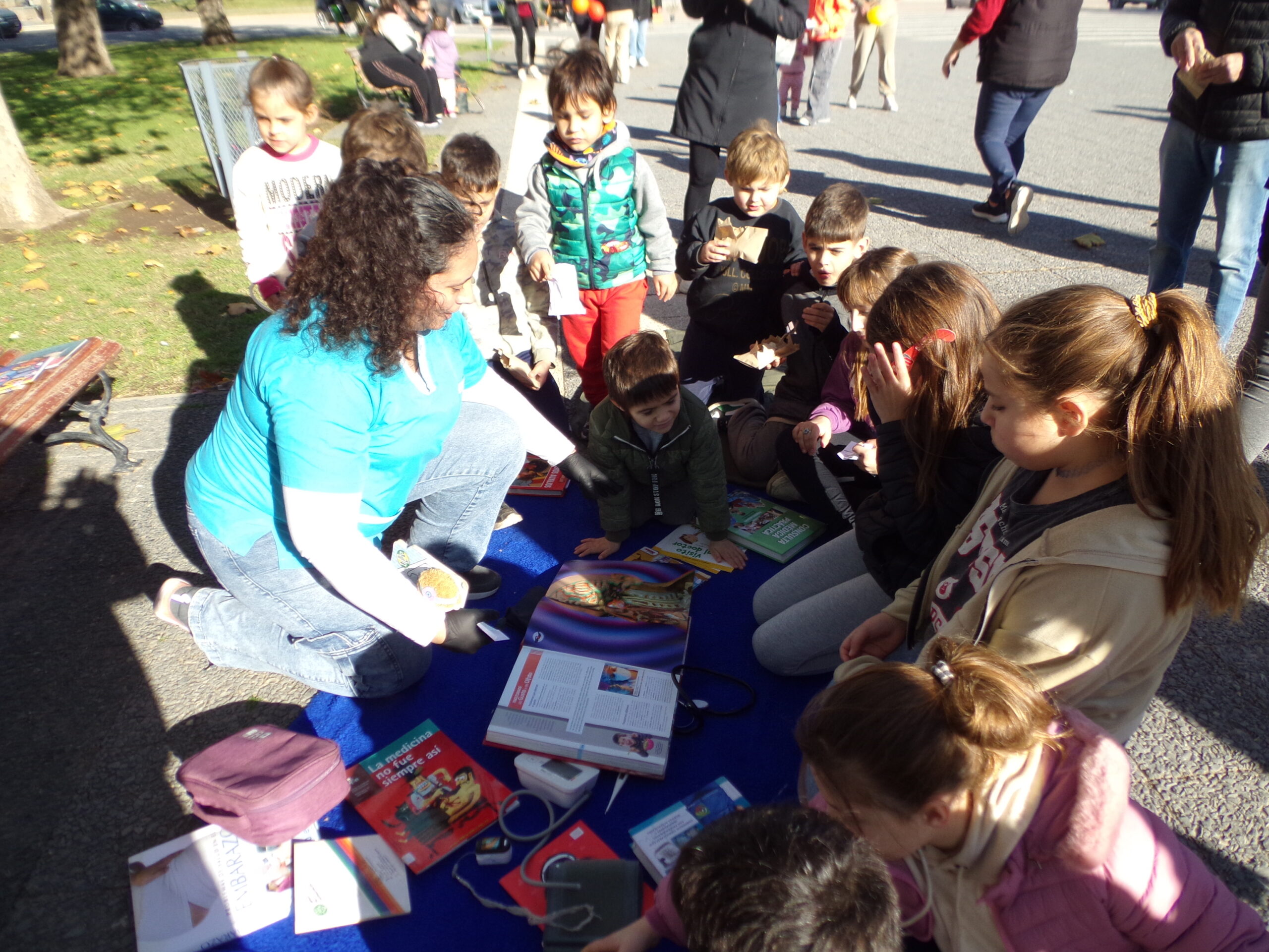 Luego, les mostró algunos de los instrumentos que utiliza en su trabajo diario y les preguntó acerca de las funciones de esos objetos. Varios niños respondieron correctamente. Para finalizar, compartió un breve cuento titulado «Pablo, el doctor»