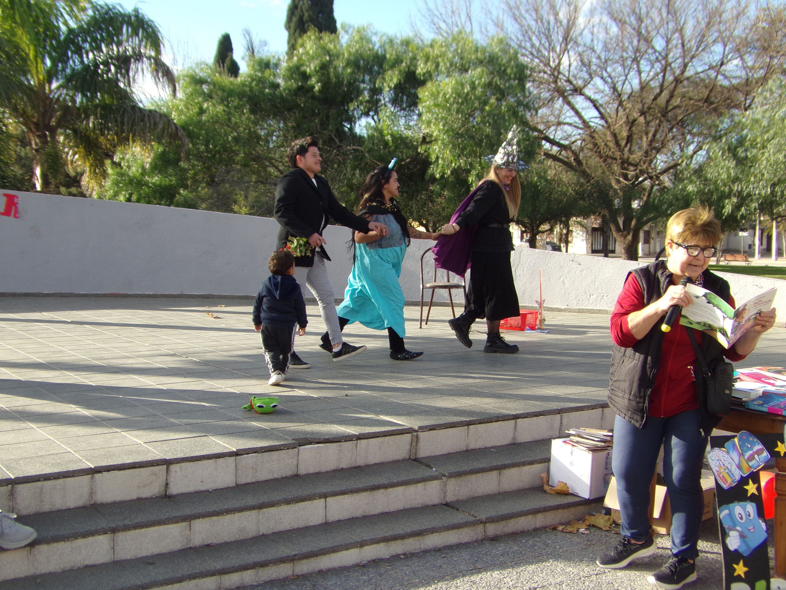 En el stand de la biblioteca, las bibliotecarias Elcira López y Alicia Alzamendi, esta última ya jubilada, compartieron la lectura del cuento «Hada desencantada busca príncipe encantador», cuya interpretación fue llevada a escena por una joven pareja de la localidad.
