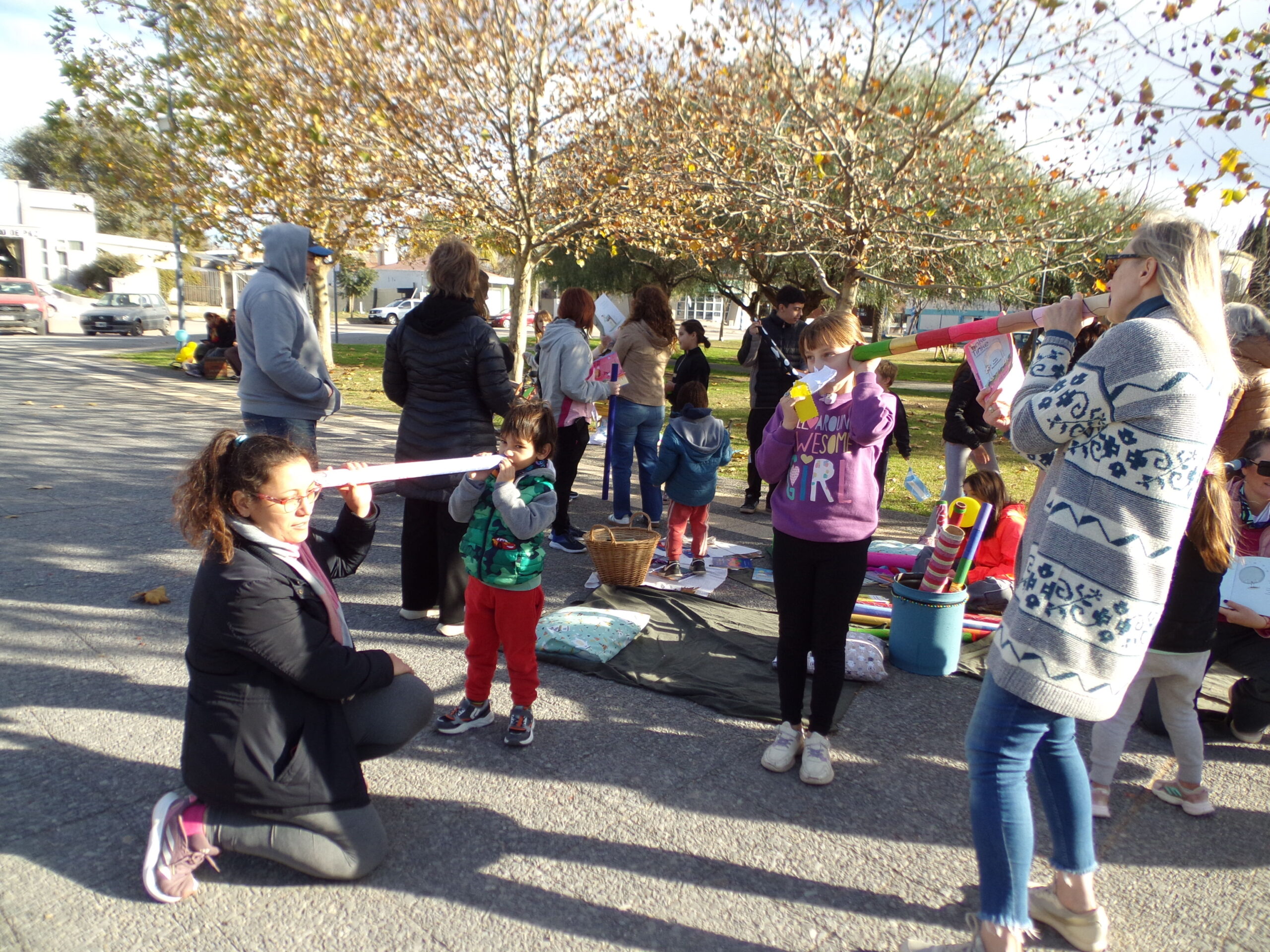 La bibliotecaria del Colegio Secundario animó a padres y madres a susurrarles cuentos a sus hijos a través de tubos circulares de cartón.