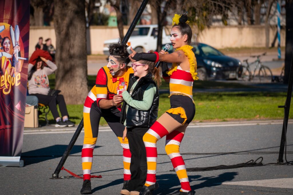 Caracterizados como payasos, Chichina (Luisina Schwab) y Tarugo (Federico Díaz) desplegaron toda su energía y carisma para brindar una producción llena de malabares, acrobacias en altura y destrezas con el monociclo, una bicicleta de una sola rueda.