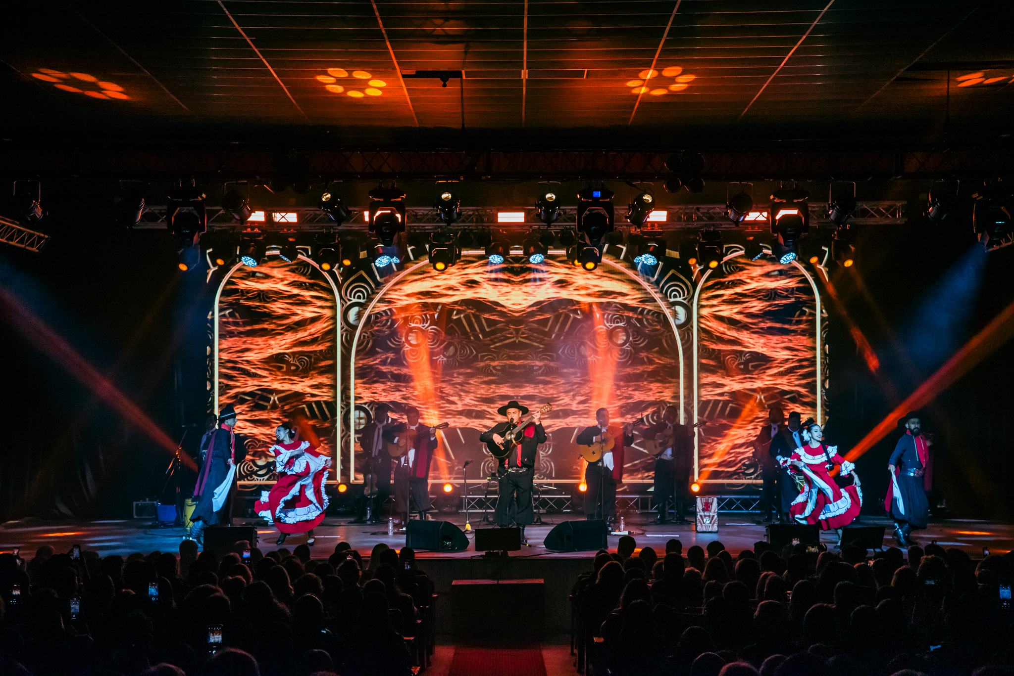 Sobre el escenario estuvo acompañado por guitarristas, violinistas, percusionistas y parejas de baile. Se destacaron un impecable juego de luces y pantallas que proyectaban diversas imágenes.