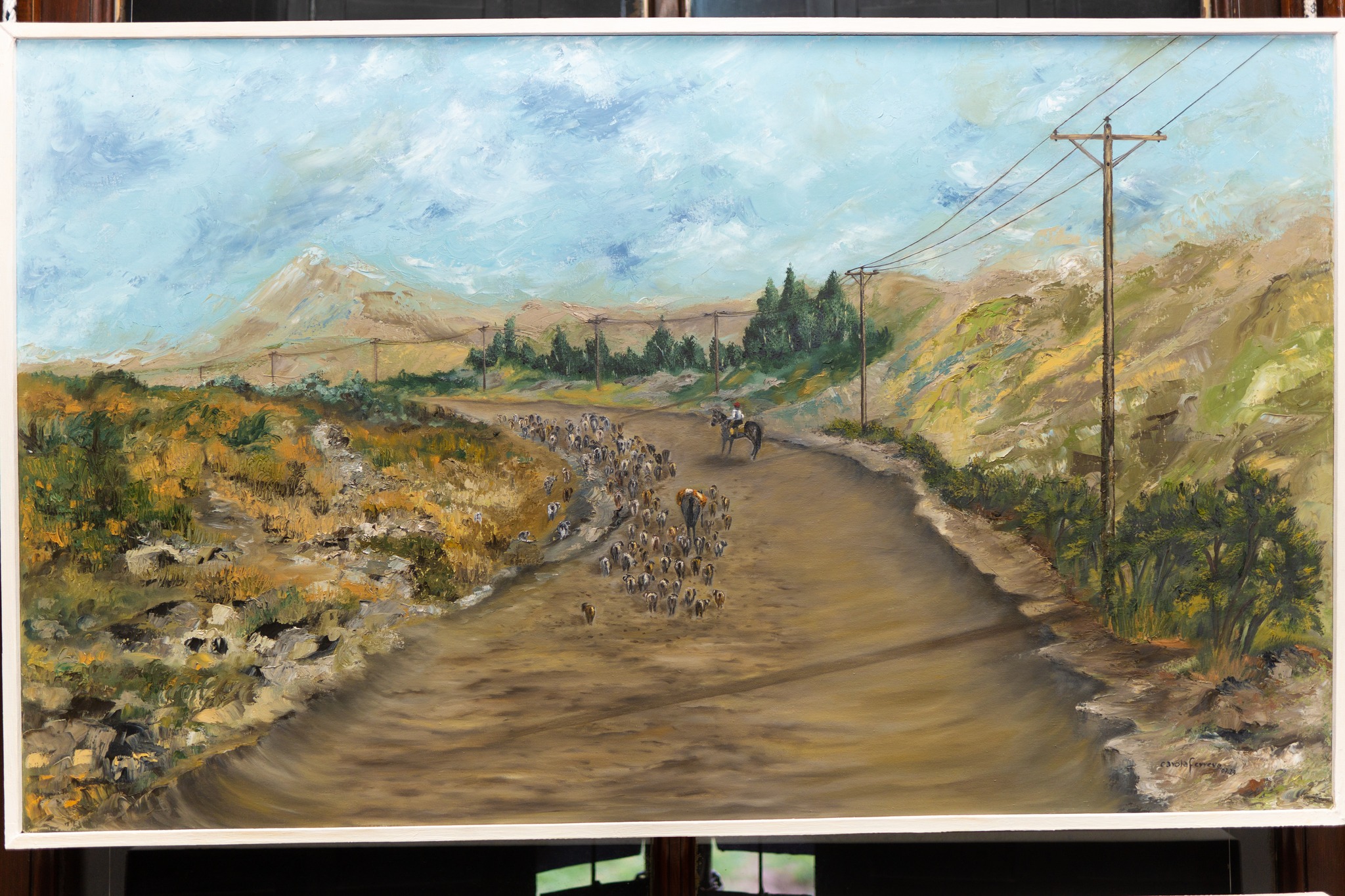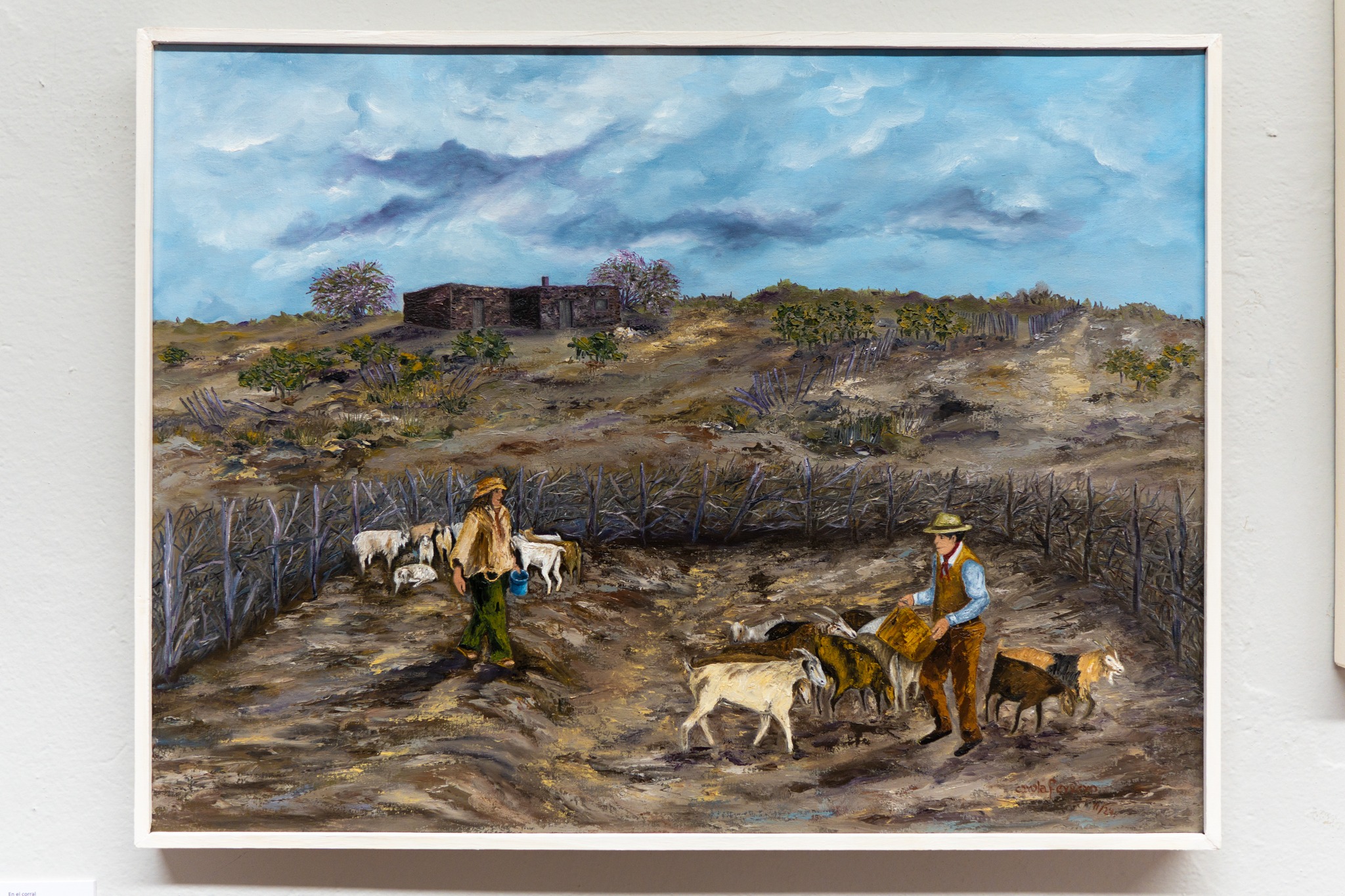En diálogo con Infowini, Ferrero explicó que su muestra Crianceros Ancestrales está compuesta por una serie de pinturas al óleo, además de pequeños formatos realizados en acuarela, tintas y anilinas. «Es un recorrido de casi dos años de trabajo donde represento a los puesteros, los crianceros o campesinos del oeste pampeano, sur de Mendoza y el norte de Neuquén. Todos ellos comparten una actividad común: la crianza de sus cabras, chivas o piños, como llaman a la majada de sus animales».