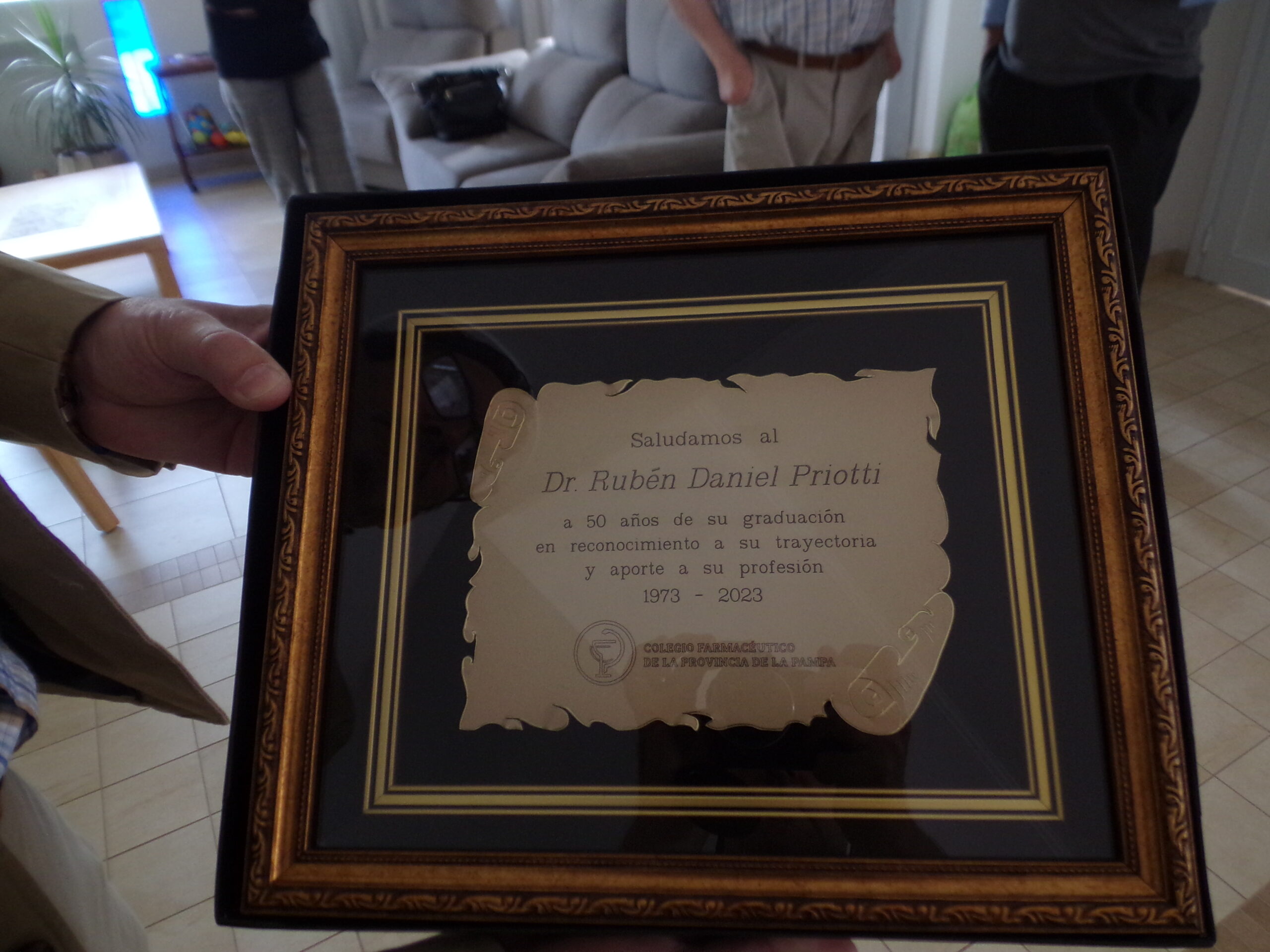 El Colegio Farmacéutico de La Pampa destacó la labor de Rubén Daniel Priotti, farmacéutico jubilado de Winifreda, otorgándole una placa por sus 50 años de graduación y trayectoria profesional. También, por sus décadas como asociado y miembro activo de la institución, donde ocupó cargos directivos.