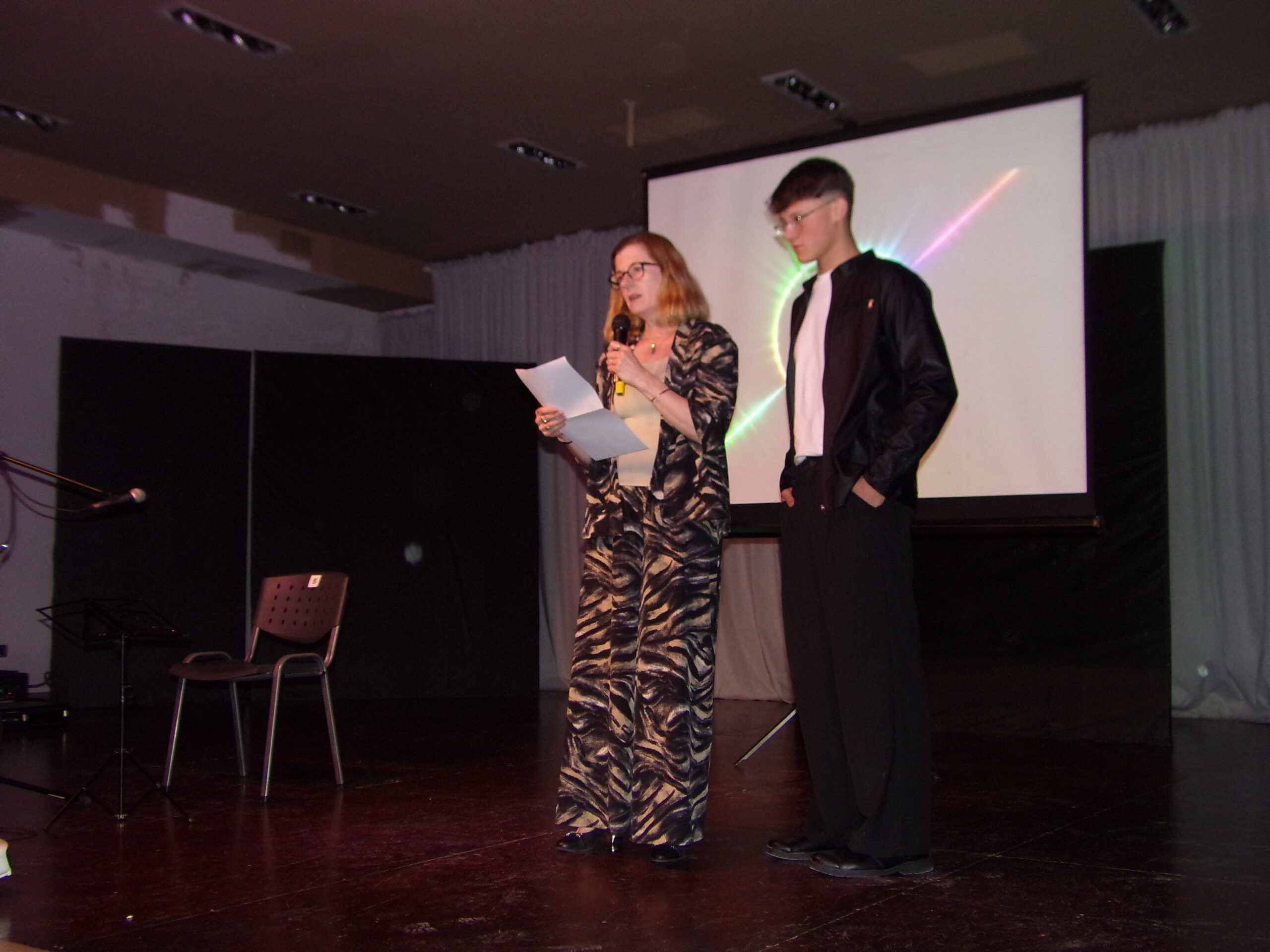 El escritor subió al escenario junto a la docente Daniela Steinbach, quien comenzó agradeciendo «muy especialmente» a la Secretaría Municipal de Cultura y a la titular del área, Kelli García, «por hacer posible este evento».
