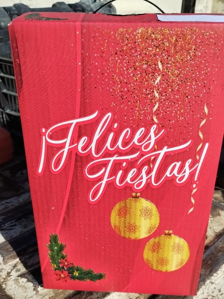 Cada caja, que fue cuidadosamente preparada, contenía sidra, vino, budín, pan dulce, mantecol, garrapiñada y un turrón, productos ideales para el brindis y la celebración de estas fiestas.