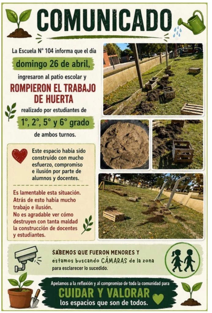 La Escuela Primaria 104 de Winifreda comunicó con pesar que, el pasado domingo 26 de abril, ocurrió un acto vandálico en el patio escolar, donde desconocidos ingresaron y destrozaron la huerta que había sido creada por alumnos de distintos grados.